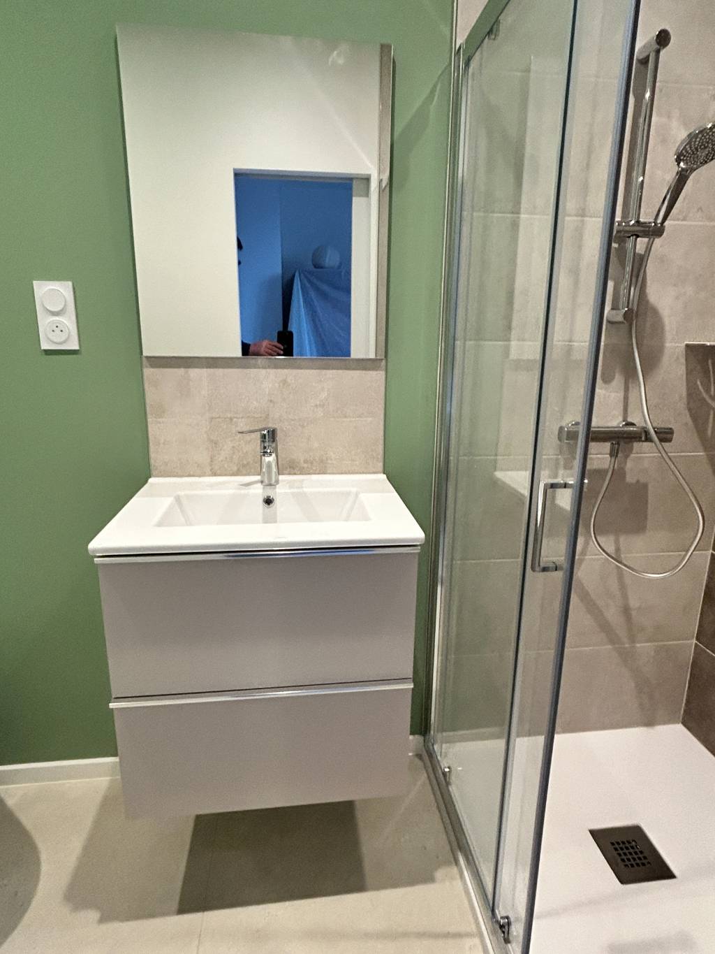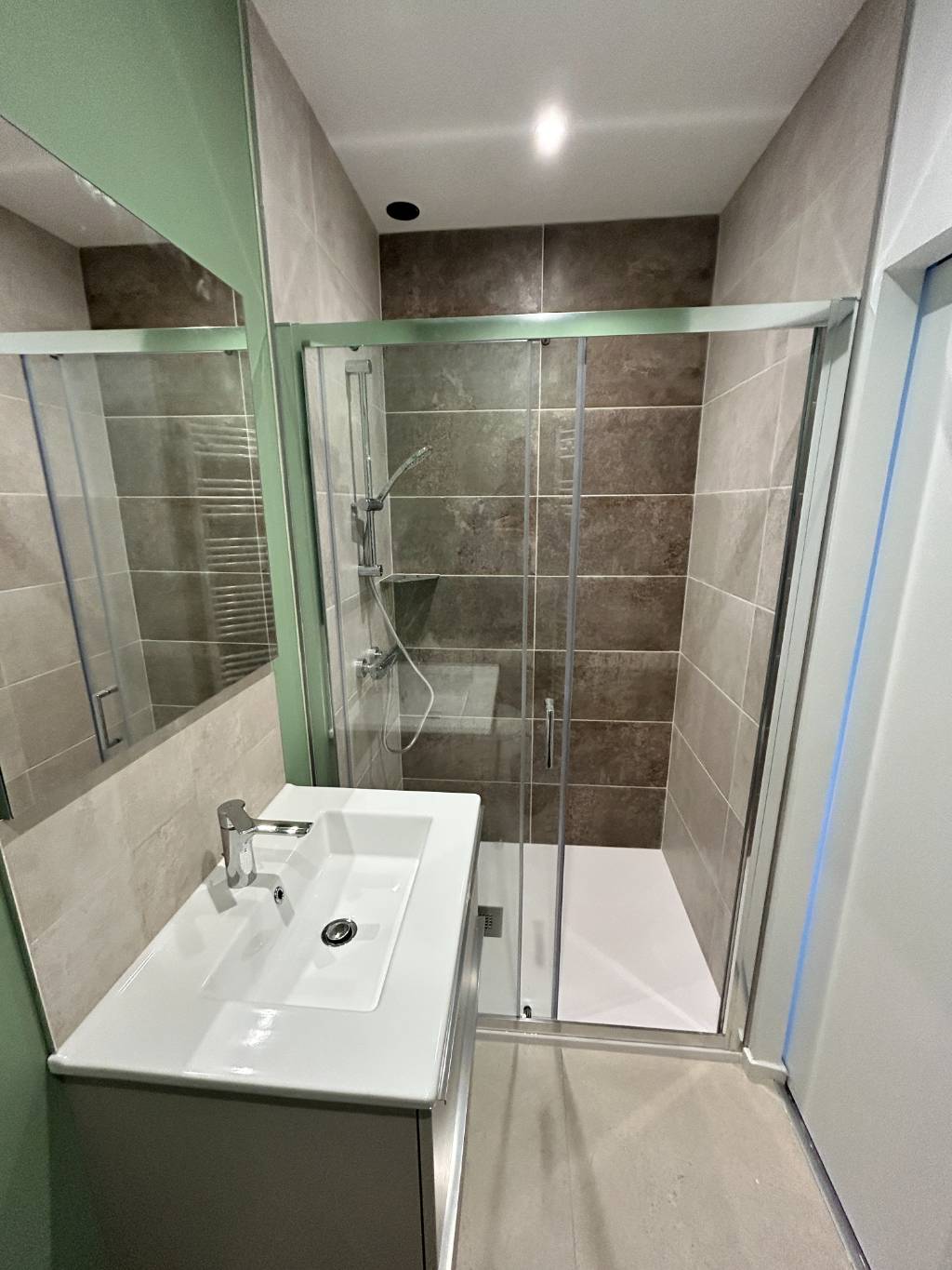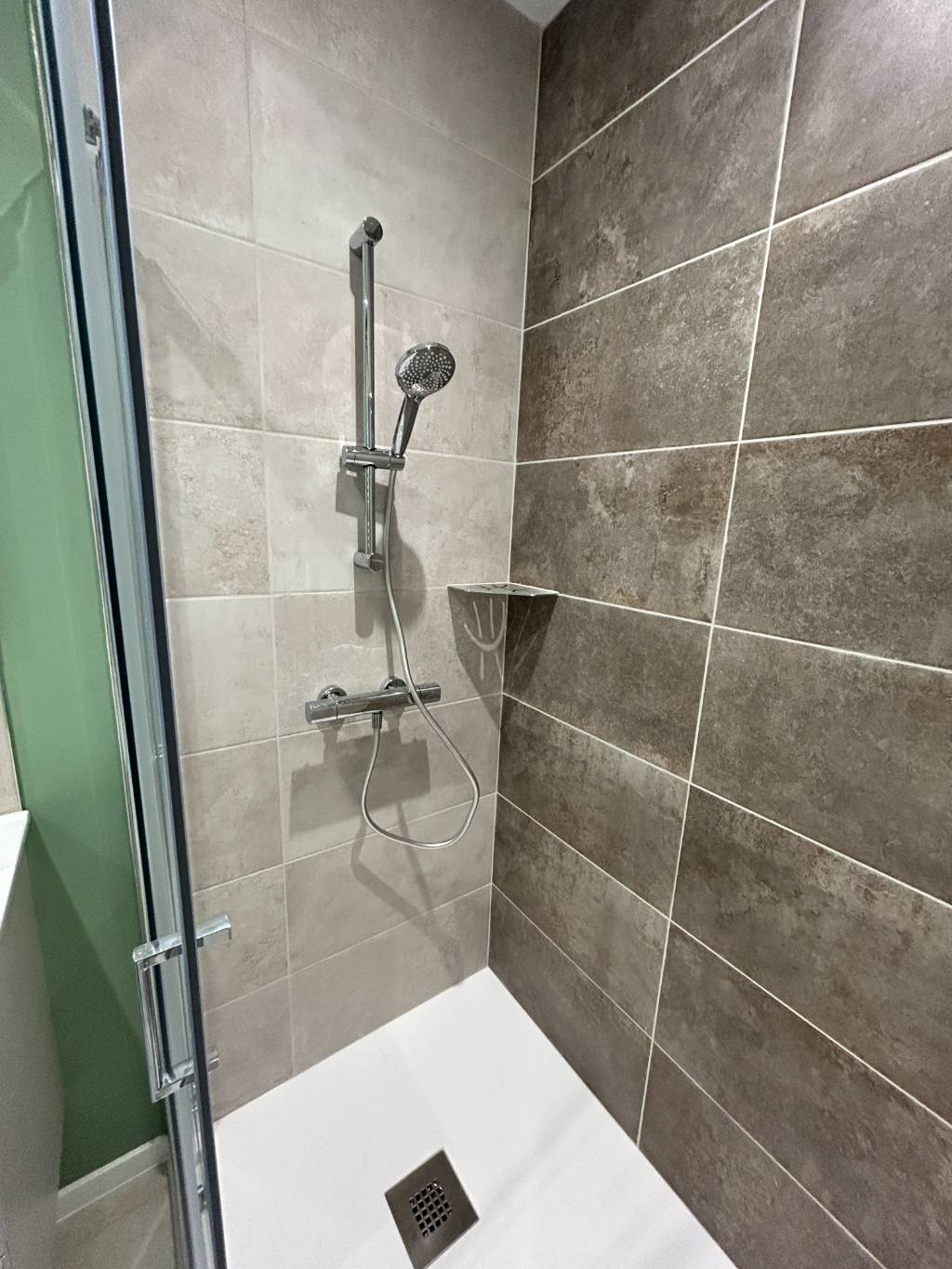 - création de l'espace douche de 90 x 120 cm avec un receveur extraplat Doccia Basalto, robinetterie thermostatique jacob Delafon, paroi de douche avec porte coulissante, tablette Schlutter Shelf, faîence 30 x 60 au mur