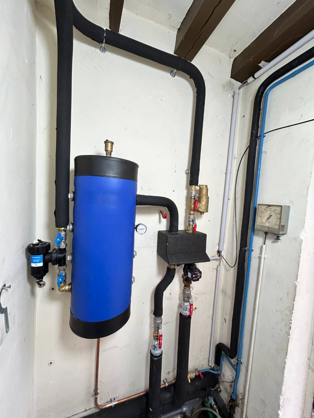 - installation de la pac en chaufferie avec réalisation des réseaux en tuyaux de cuivre de diamètre 28 mm pour assurer le débit d'eau nécessaire. Pose d'un ballon tampon et d'une bouteille de découplage.